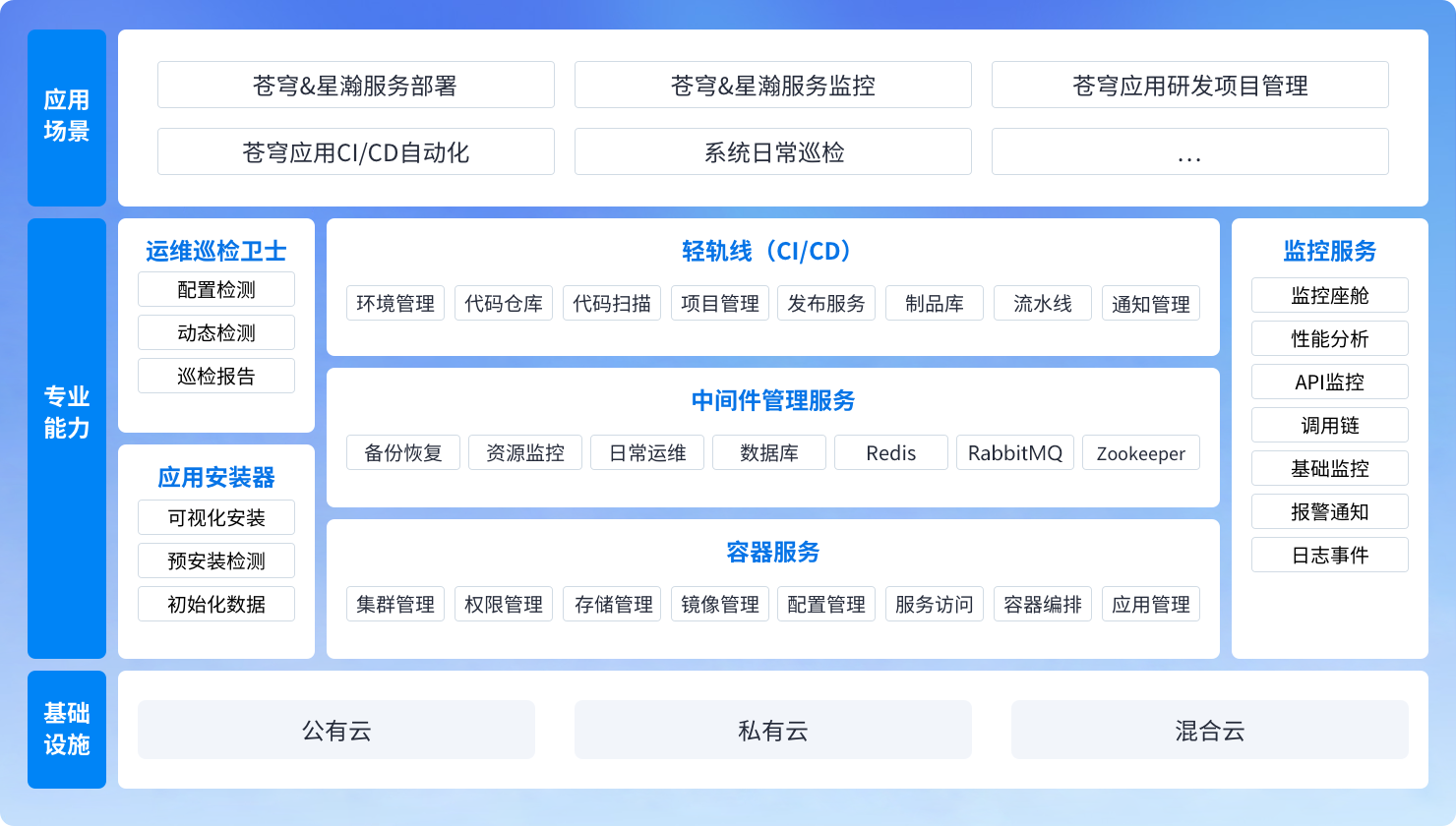 苍穹gPaaS为用户提供安装器、容器服务、监控报警、CI/CD和中间件管理服务,实现苍穹开发运维一体化,提高苍穹系统可扩展性、稳定性和迭代敏捷性
